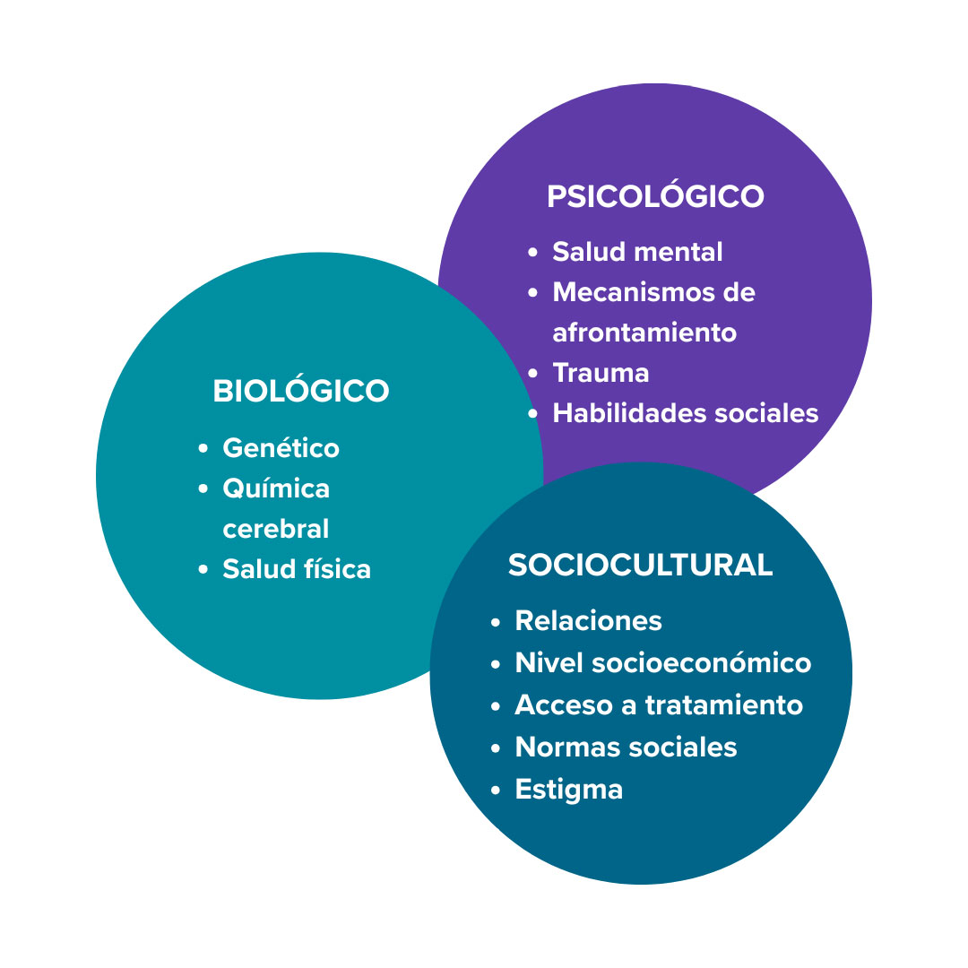 Nada por sí solo causa adicción. Por eso... el modelo biopsicosocial se desarrolló. Explica cómo se desarrolla la adicción cuando alguien se enfrenta a una combinación de vulnerabilidades biológicas (como la genética), desafíos psicológicos (como traumas o problemas de salud mental) y circunstancias sociales (como su entorno o sus relaciones).